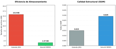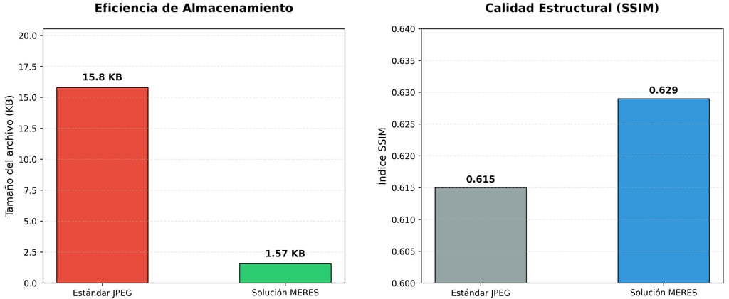 Los resultados obtenidos confirman que la arquitectura MERES ofrece una eficiencia disruptiva en comparación con los métodos de compresión tradicionales. Mientras que el estándar JPEG requiere aproximadamente 15.8 KB para transmitir una imagen con pérdida de fidelidad estructural, nuestro sistema logra reducir ese peso a tan solo 1.57 KB, manteniendo una calidad visual superior.