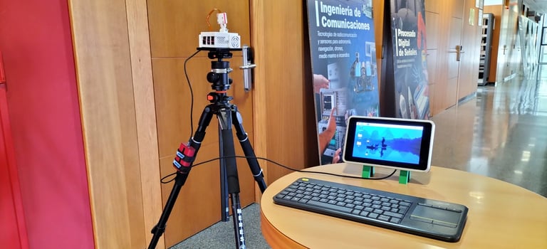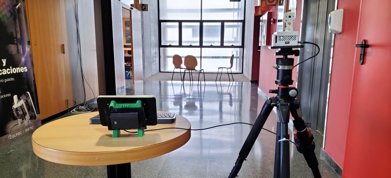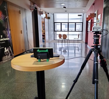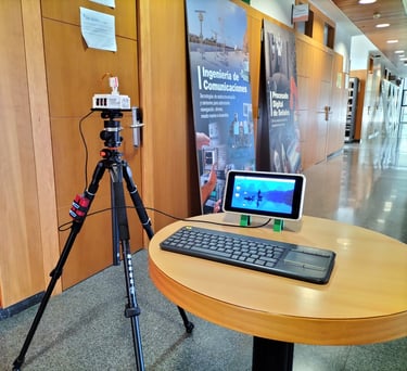 El montaje emplea un prototipo de alta fidelidad sobre una estación de medición estable en el IDeTIC. Aunque el entorno es controlado para asegurar la repetibilidad de los datos, el sistema se somete a retos operativos reales: se capturan texturas y materiales portuarios críticos (metales, hormigón, señales...) y se valida la transmisión a través de una red inalámbrica activa, enfrentando las fluctuaciones de ancho de banda y latencias propias de una conexión industrial.