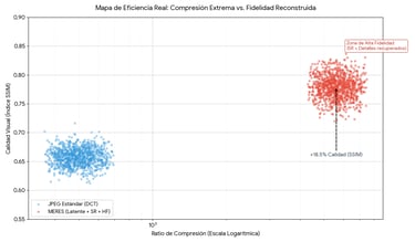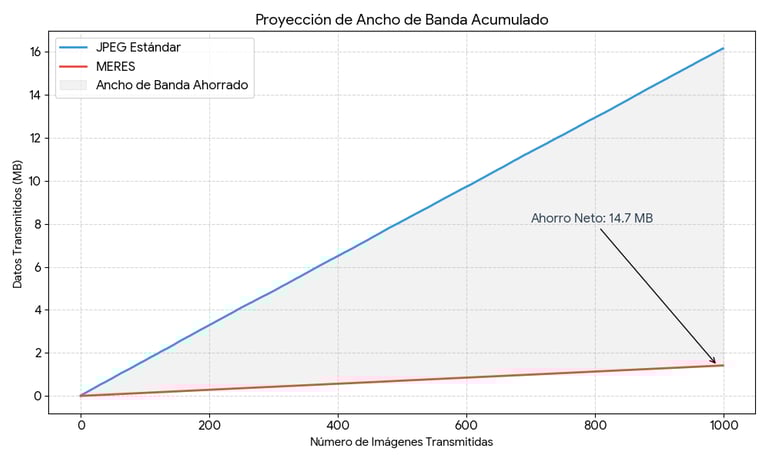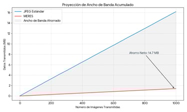 MERES: No transmite la imagen per se, sino que extrae y transmite su espacio latente (representación matemática compacta). Esto permite reconstruir la imagen en destino con un consumo de datos infinitamente menor y con una capa de seguridad extra.