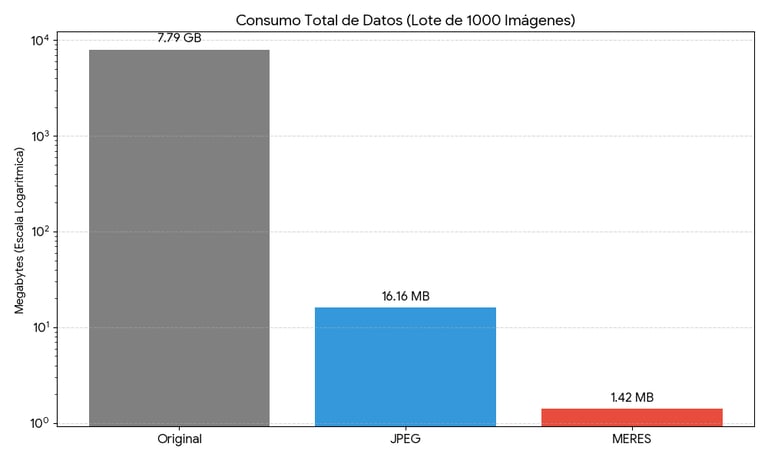 Los resultados obtenidos validan las cuatro etapas clave del sistema MERES: Adquisición, Compresión, Transmisión y Reconstrucción. Para validar el desempeño del sistema en un entorno real, se llevó a cabo una recolección masiva de datos compuesta por más de 1.000 frames (muestras). Estas imágenes originales oscilaron entre 7 MB y 9 MB cada una.